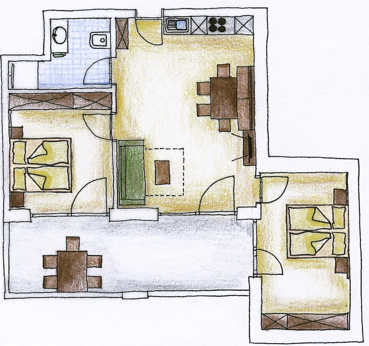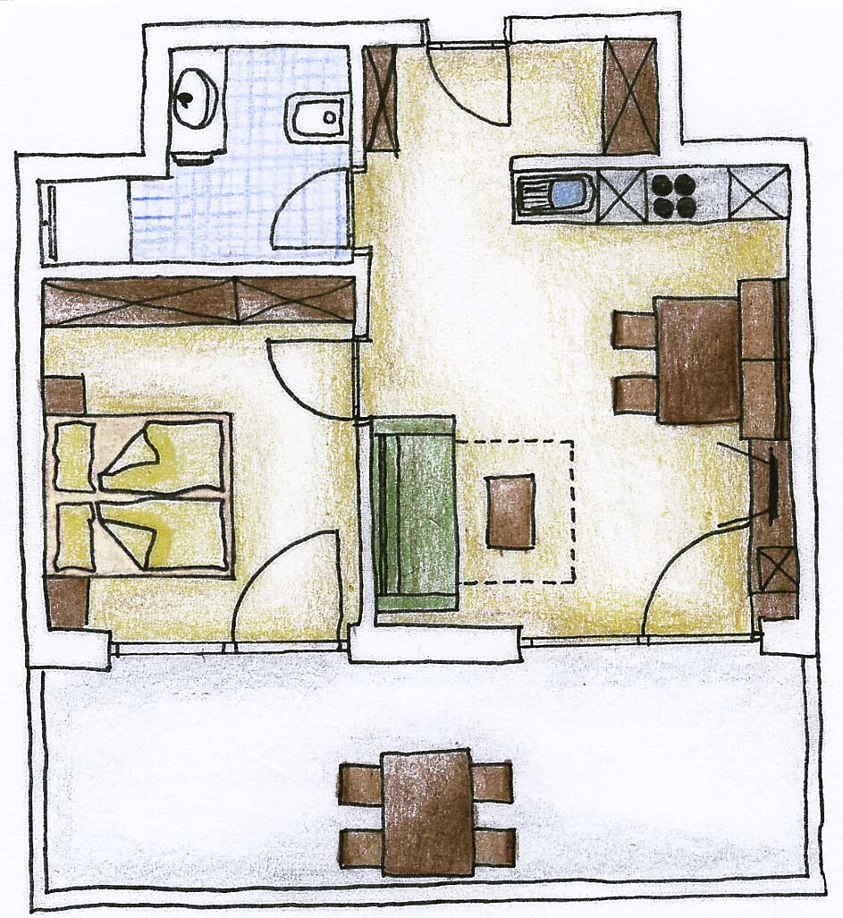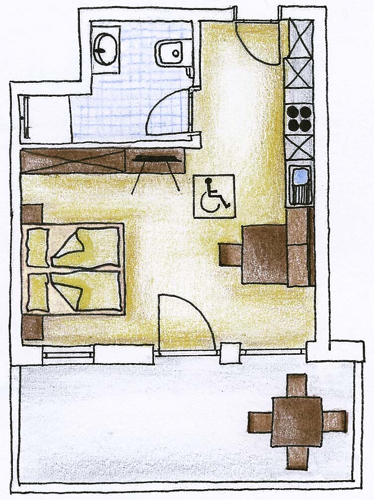 Si tratta della tipologia di appartamento più grande situato a pianterreno e composto da un soggiorno luminoso con cucina, due camere da letto separate, bagno moderno e terrazza soleggiata che da su un ampio prato verde.