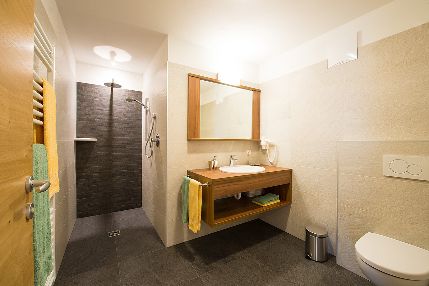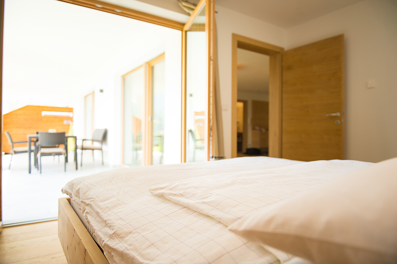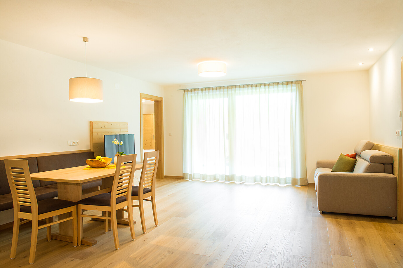Si tratta della tipologia di appartamento più grande situato a pianterreno e composto da un soggiorno luminoso con cucina, due camere da letto separate, bagno moderno e terrazza soleggiata che da su un ampio prato verde.