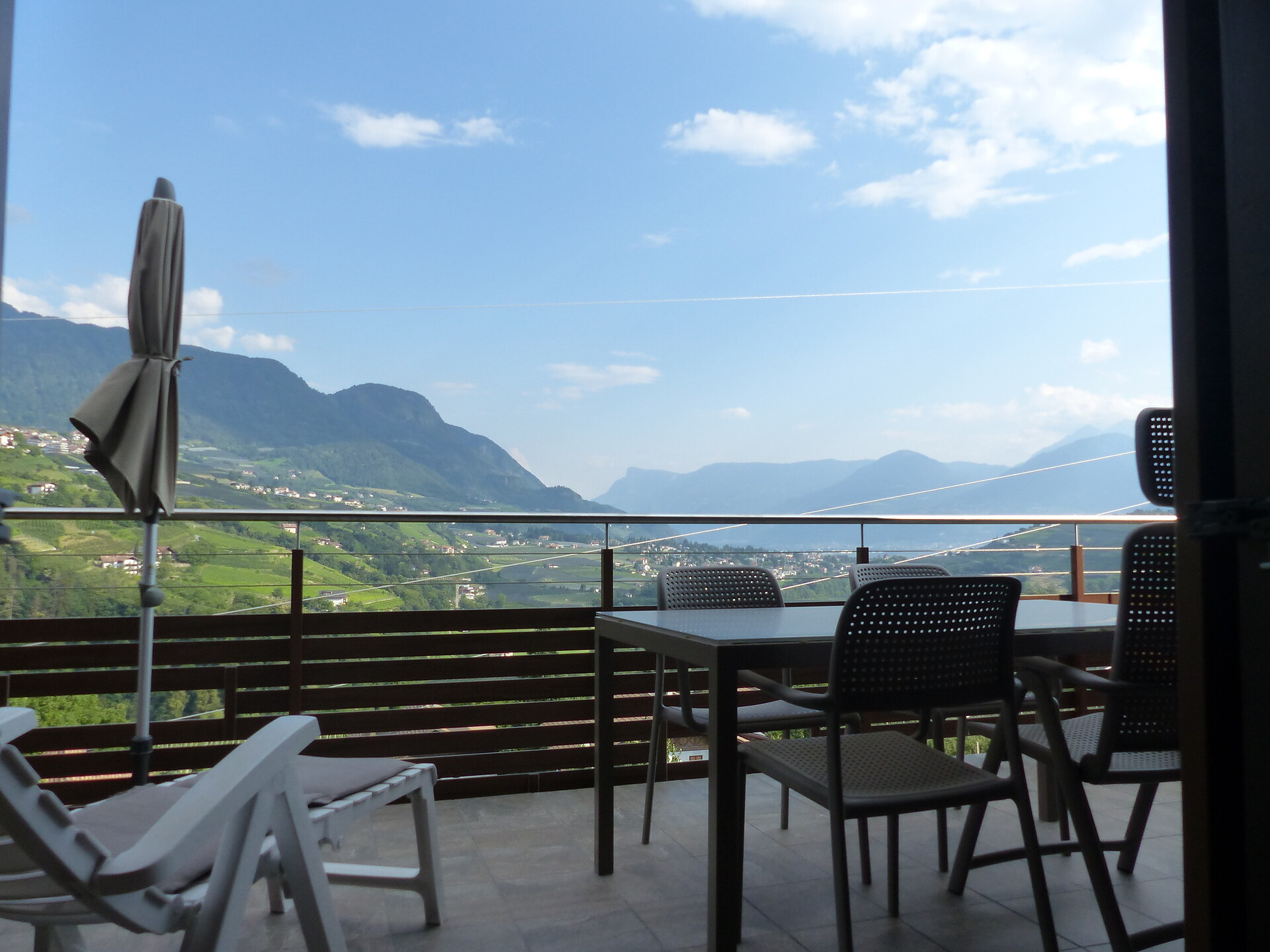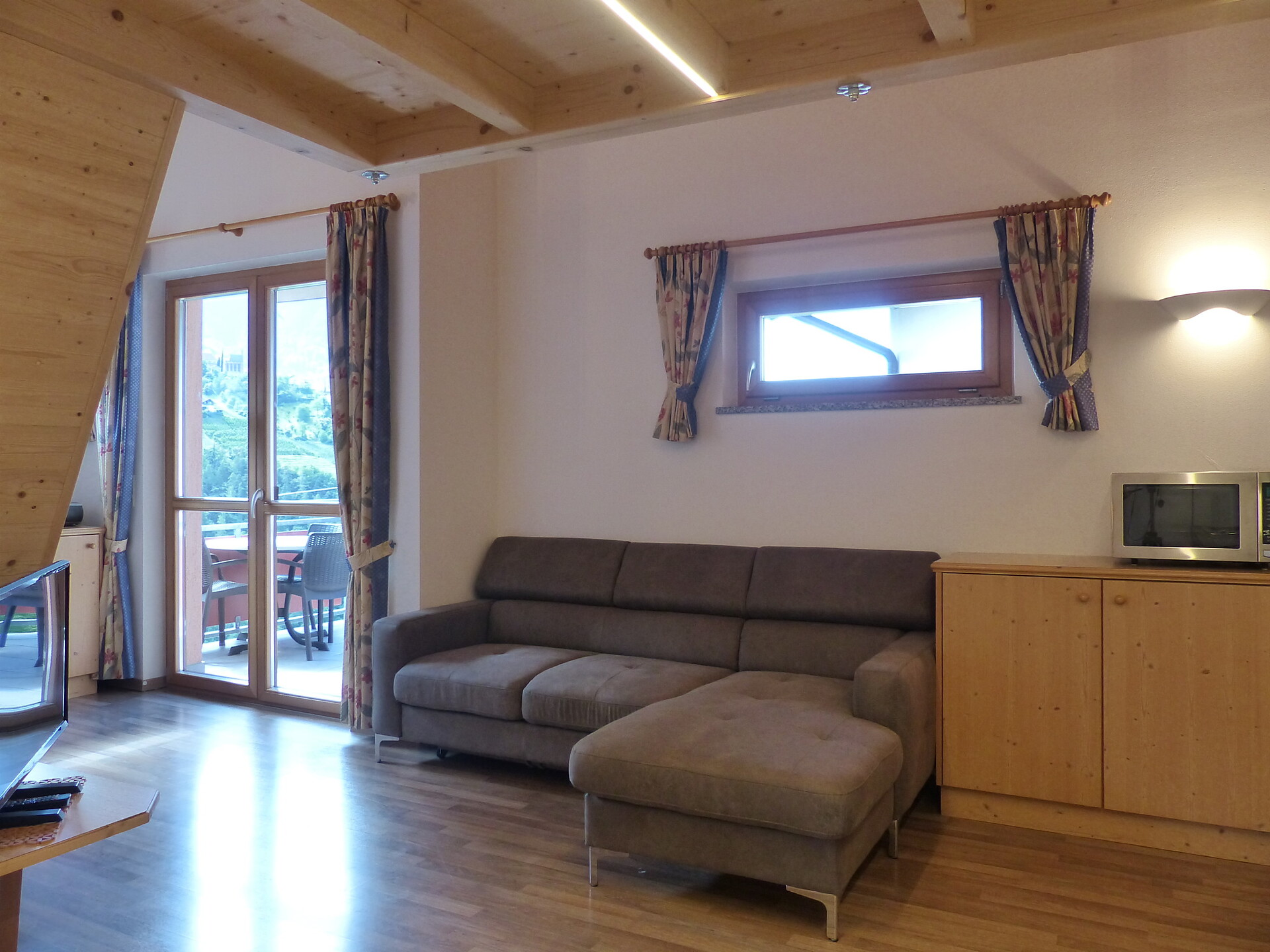 Appartamento spazioso, arredato di un soggiorno con angolo cottura e un comodo divano, una galeria con altri due letti, camera matrimoniale , doccia/wc con finestra e un balcone verso sud con meravigliosa vista su Merano e Scena. Questo appartamento può essere collegato con il miniappartamento accanto.