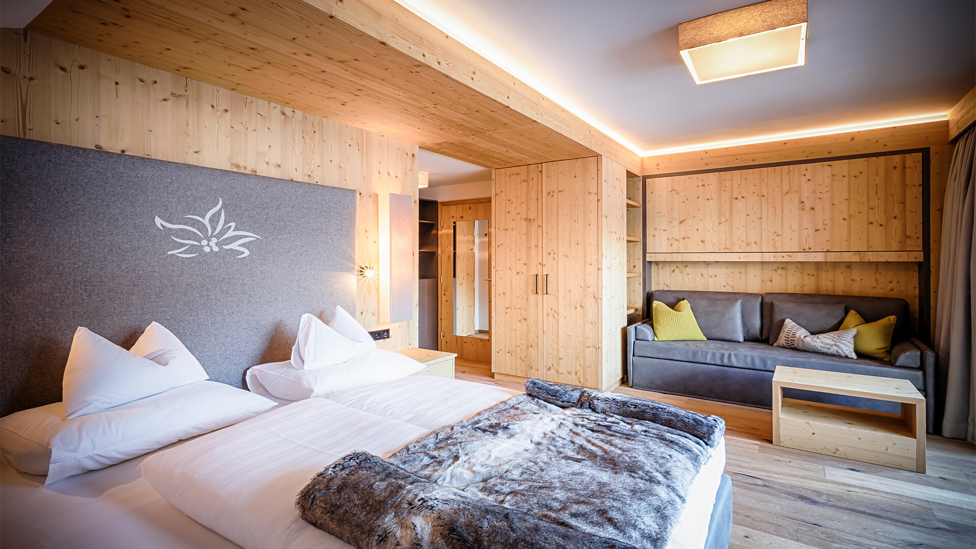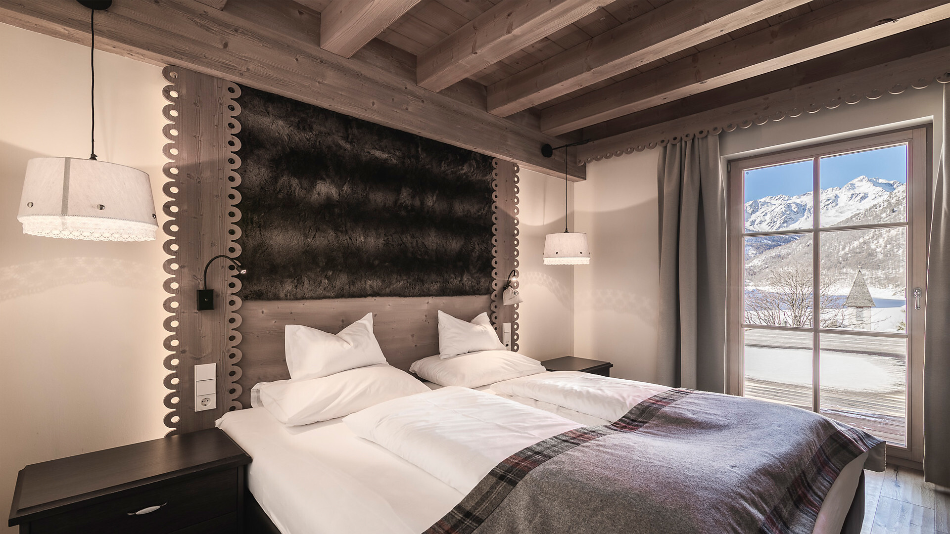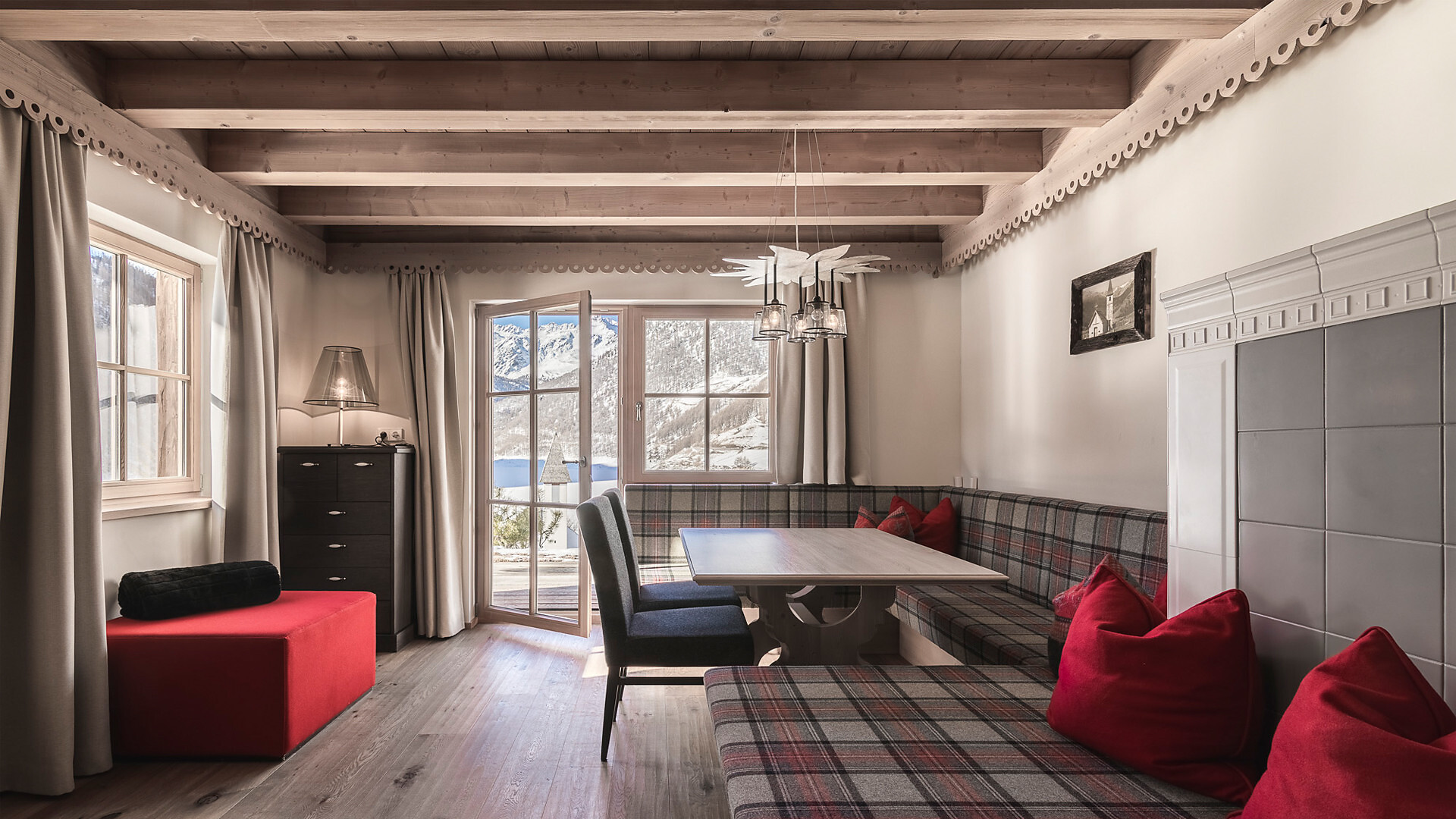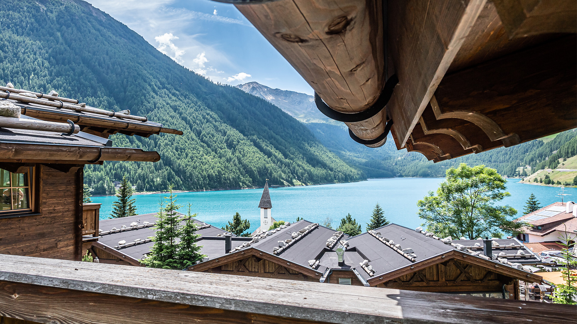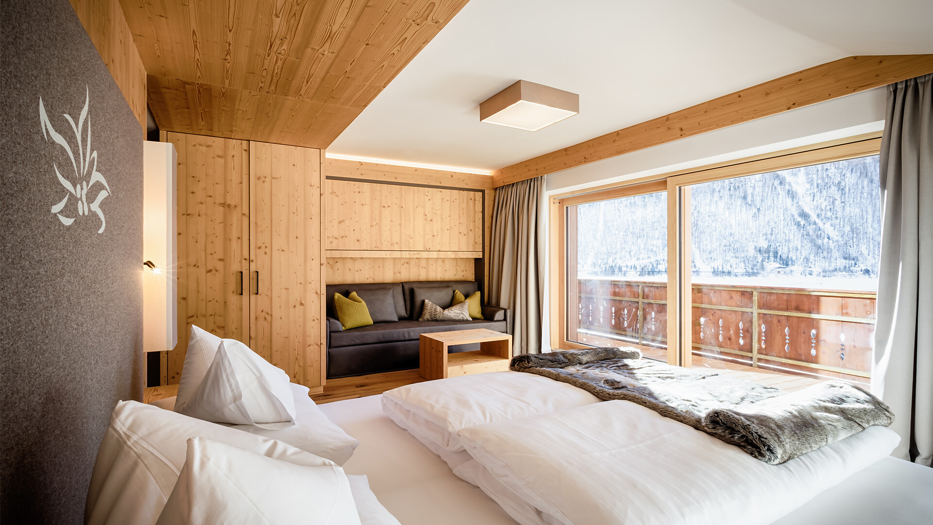 60 m² di stile alpino | Zona giorno e notte separate | Terrazza con vista spettacolare sul lago e sulla montagna | Bagno, WC, doccia e asciugacapelli, teli e accappatoi per il centro benessere alpino | Must Have: TV, WIFI, cassetta di sicurezza.
