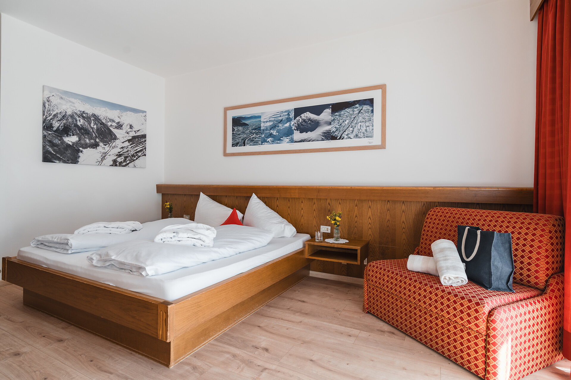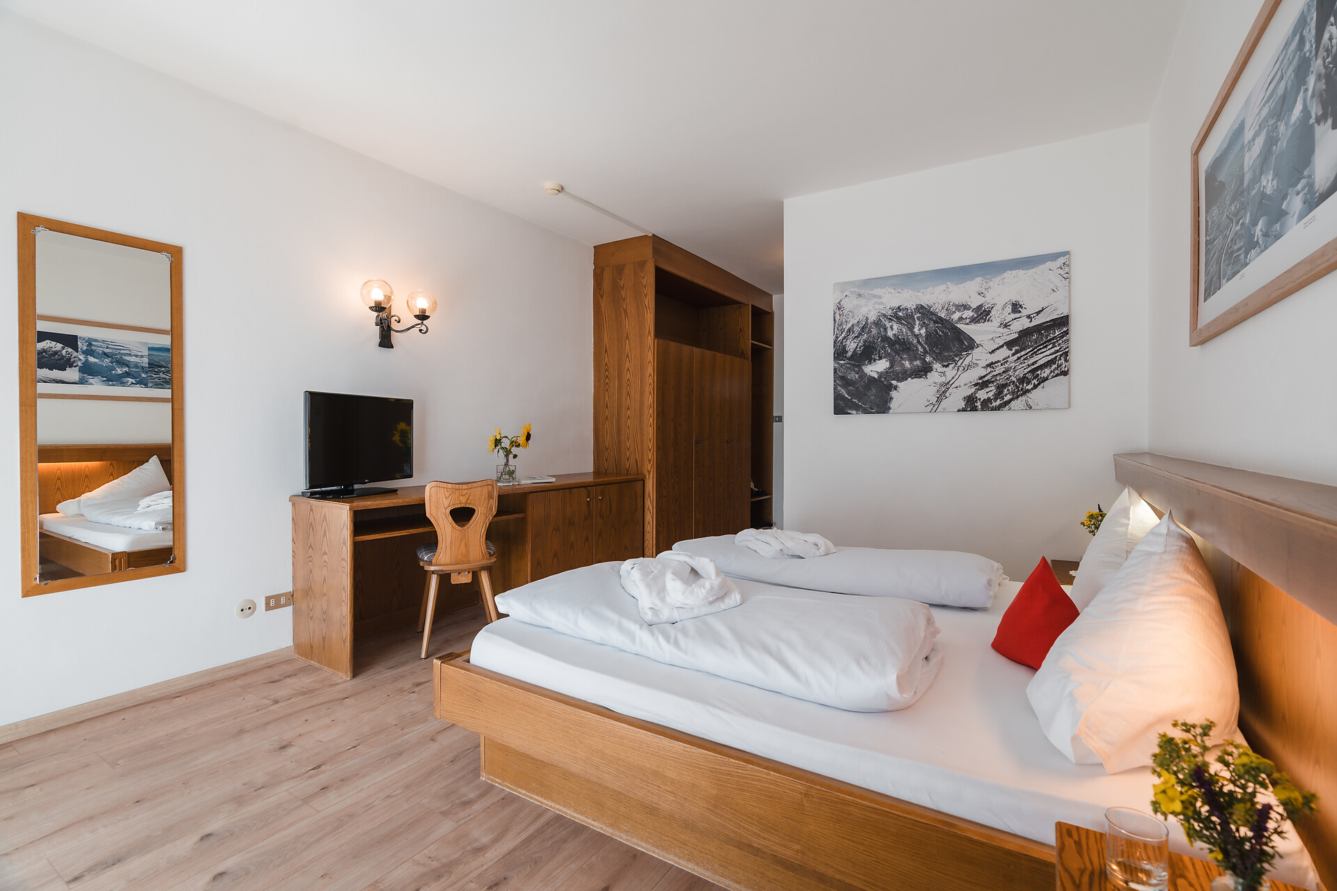 La nostra camera doppia, arredata con cura, è il luogo ideale per rilassarsi e sentirsi bene - con una splendida vista a sud o nord e accesso diretto a un balcone privato. Godetevi l' aria fresca di montagna e il panorama alpino - perfetto per iniziare la giornata con tranquilità o per concluderla in totale relax.