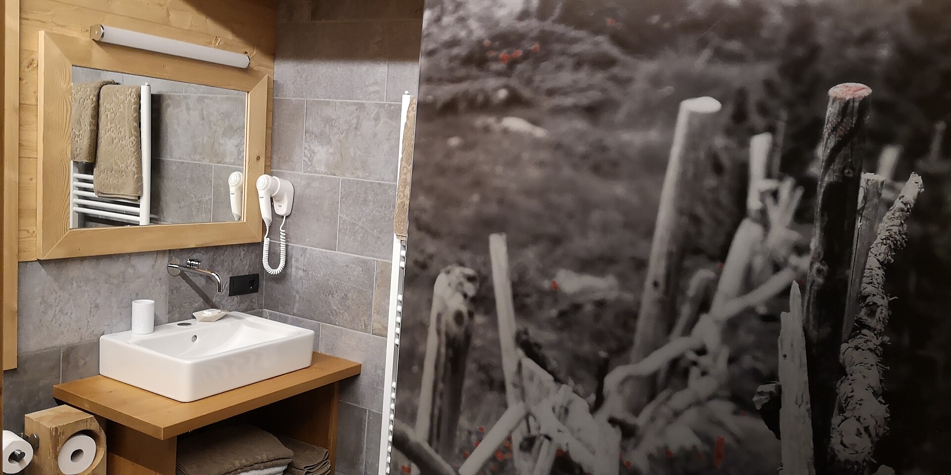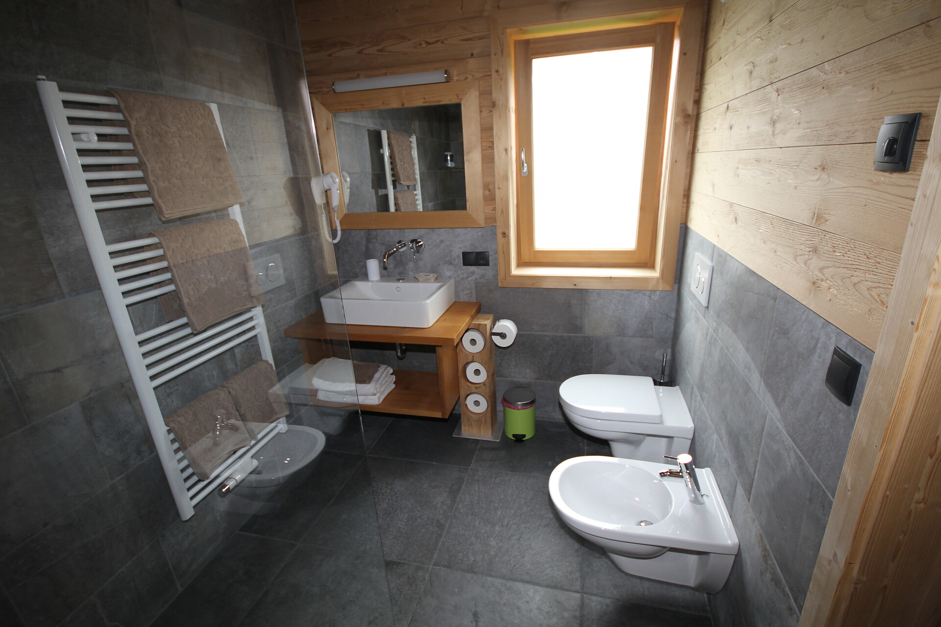 Bagno con grande doccia, lavandino, WC , bidet , asciugacapelli, scalda salviette, asciugamani , 2 accappatoi e prodotti per il bagno.