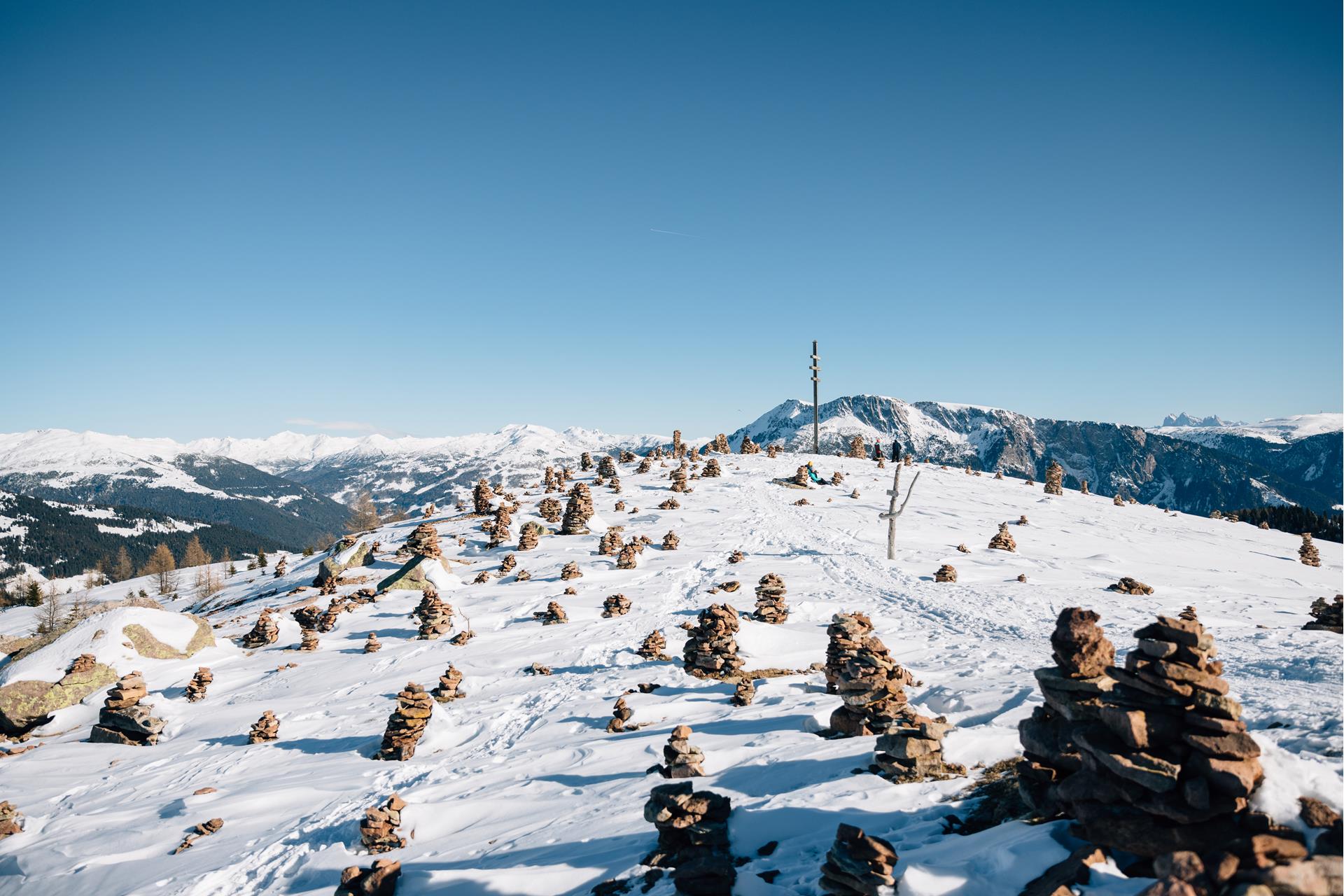 De kleine stenen mannetjes zijn ook te vinden in andere delen van Zuid-Tirol en doen vaak dienst als oriëntatiepunt. Ze werden door de herders gemaakt om de tijd te doden. Maar alleen hier, boven de dorpen bij de Tschögglberg bevindt zich een dergelijke ophoping van kleine stenen piramiden. Sommige bevatten zelfs prehistorische kenmerken.